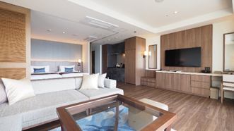 客室には、キッチン・冷蔵庫・調理器具・食器・乾燥機付き洗濯機等、上質なロングステイをかなえる生活用品を常備する他、「暮らせるリゾートパスポート」のプラン特典として、炊飯器、掃除機、体重計もご用意いたしました。また、サウナ付き露天風呂の大浴場、フィットネスジム、インドア・アウトドアの2つのプール等、ホテルコンドミニアムならではの充実の共用施設をご利用いただけます。当ホテル自慢の選べる7種類のダイニングをご利用いただけることはもとより、レストラン、バー、デリ&スイーツが10%offとなるスペシャル特典もご用意いたしました。