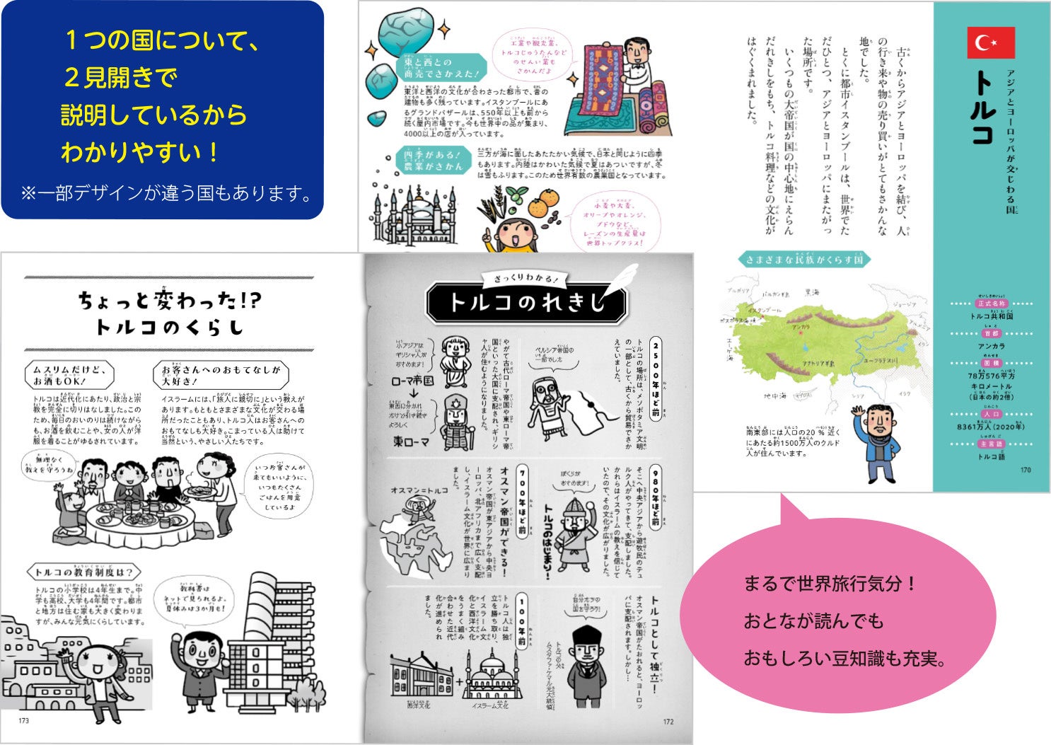 それぞれの国の特徴や文化だけでなく、その国のなりたちや、民族や宗教のなぞのことなど、ステレオタイプではないリアルな生活が学べます。