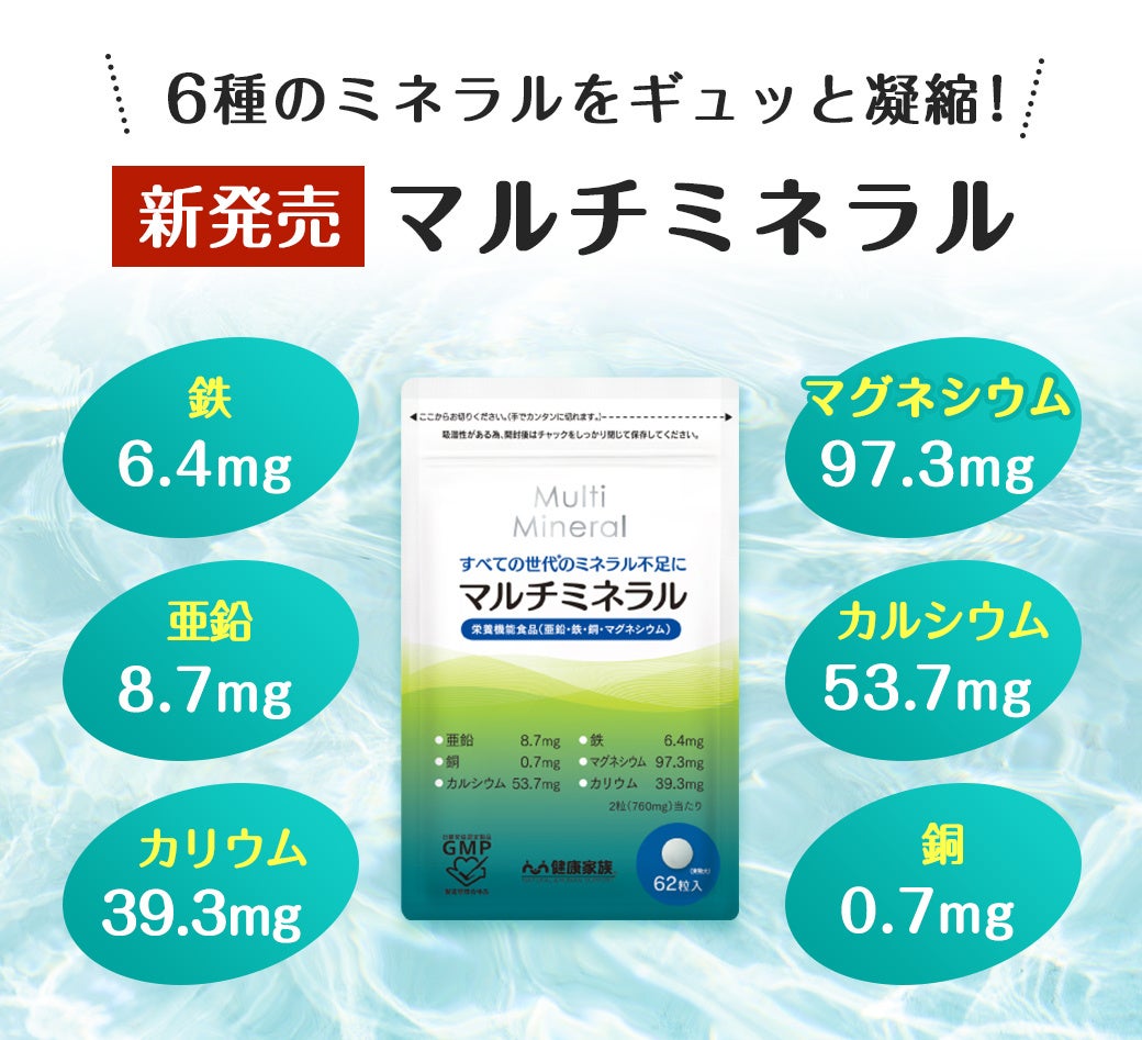 しかし、普段の食事に健康家族の<マルチミネラル>を1日2粒プラスすれば、特に必要な必須ミネラル6種類(鉄・カルシウム・亜鉛・マグネシウム・カリウム・銅)を手軽に補給することができる。