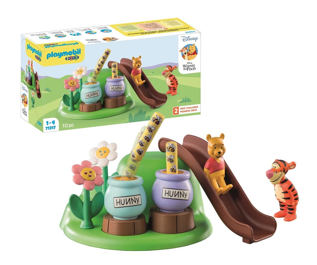 スティックをハニーポットに押しこむと、飛び出すギミック付き。また、すべり台からフィギュアをすべらせて遊ぶことができます。