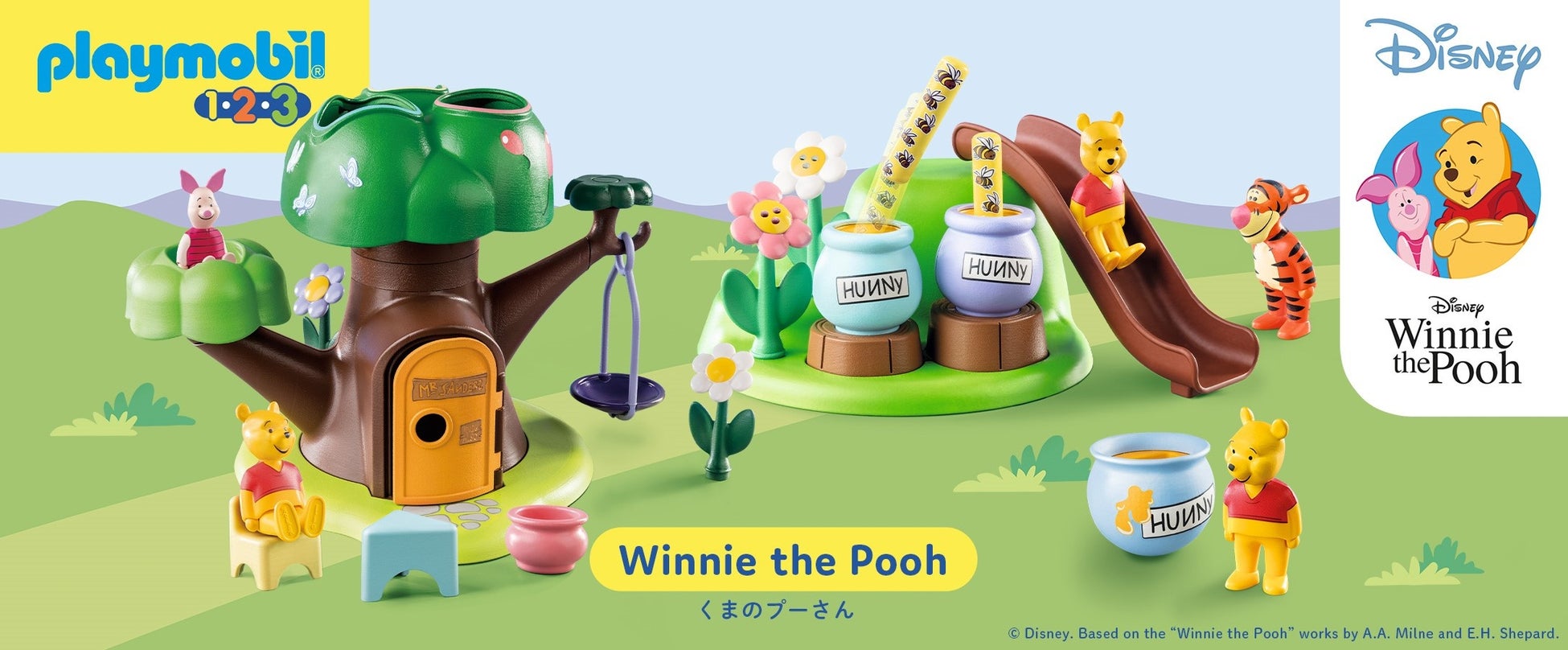 プーとティガーのフィギュア、すべり台つきのおにわ、ハチが描かれたスティックのセットです。