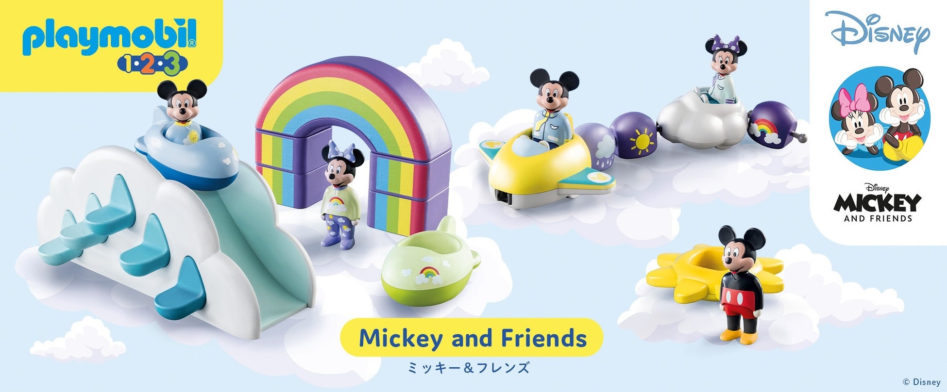 ミッキーとミニーのフィギュア、くものおうち、虹、ボートなどのセットです。
