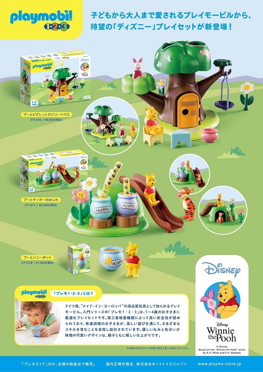 『バック・トゥ・ザ・フューチャー』や『ゴーストバスターズ』など、数々の人気タイトルのアイテムを発表してきた「プレイモービル」が、『ディズニー』のアイテムをリリースするのは今回が初となります。第1弾として、『くまのプーさん』と『ミッキー&フレンズ』より6アイテムがラインナップされています。本シリーズは、第三者検査機関によって高い安全性が認められており、発達段階のお子さまが、楽しい遊びを通して、さまざまなスキルを育むことを目指し設計されています。優しい丸みと色合いが特徴の可愛いデザインは、親子ともに嬉しい仕上がりです。
