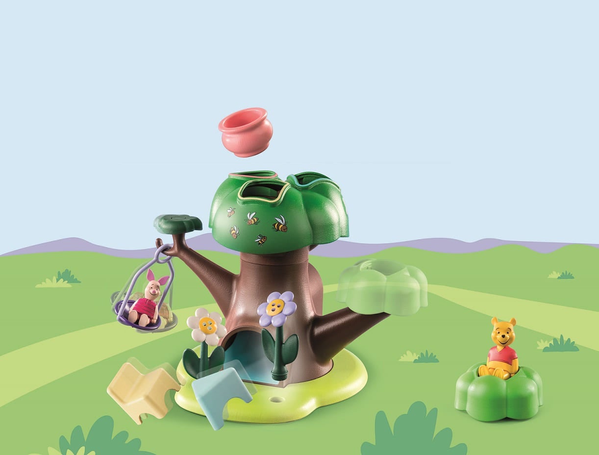 プーとピグレットのフィギュア、ツリーハウス、お花、イスやハニーポットのセットです。