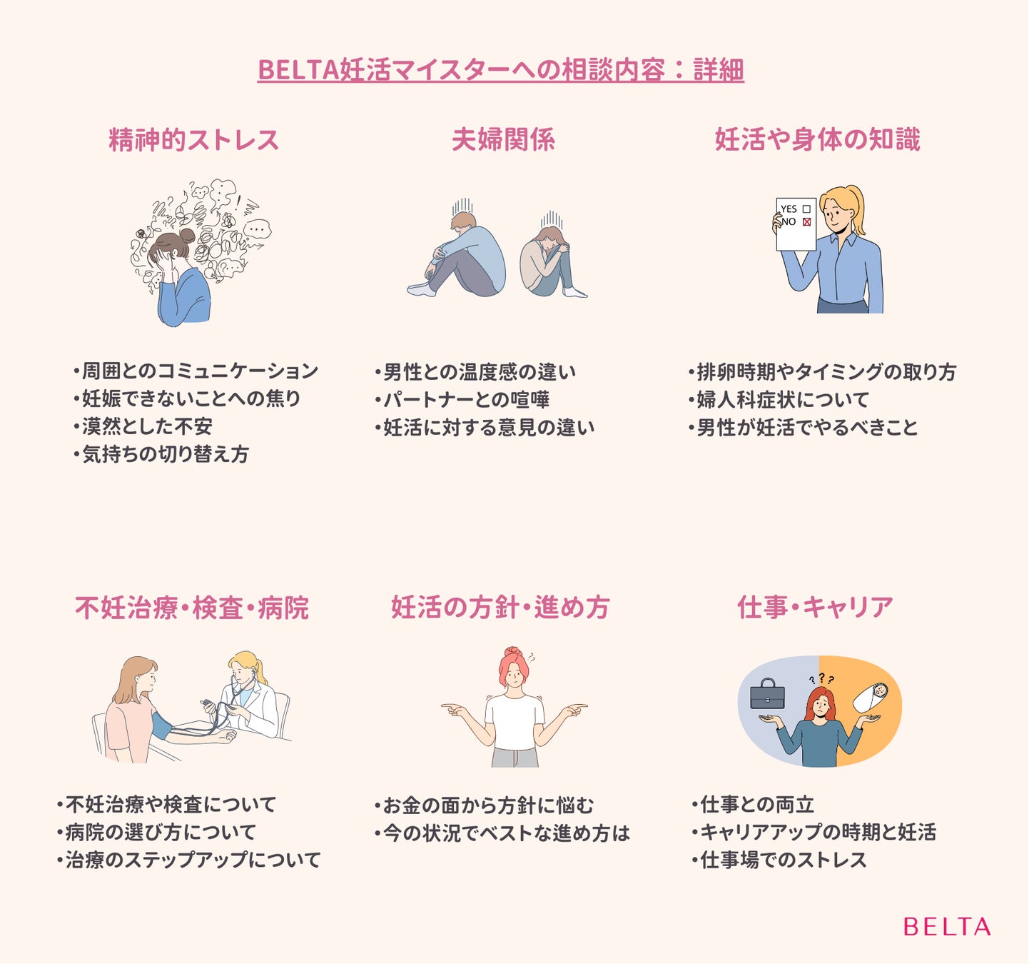 現在BELTAには「妊活」に関連することを相談いただける専門家が複数在籍しています。妊活におけるお悩みや、食事のこと、病院選びに関するご相談までご自身のお悩みにあった専門家にご相談いただけます。