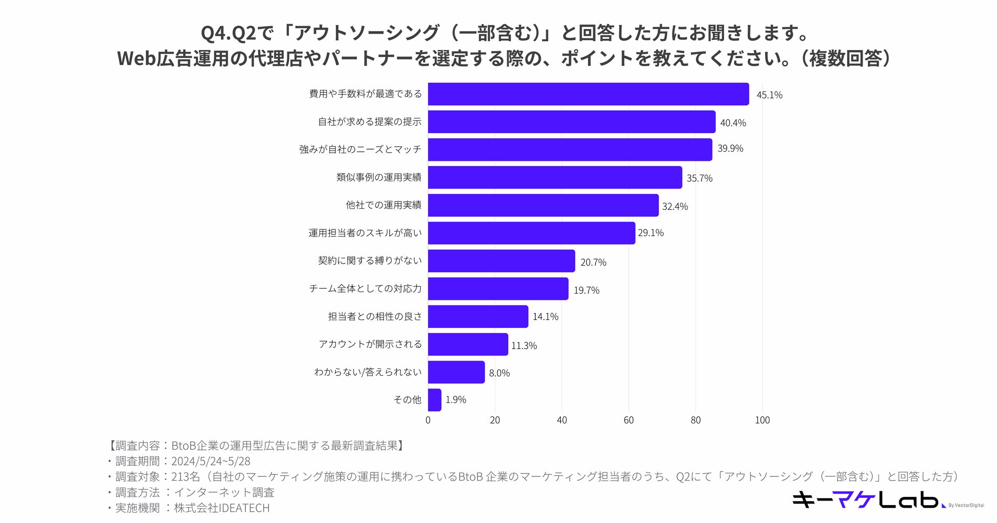 Web広告運用のパートナーを選定する際のポイントは「費用や手数料が最適である」が45.1%で最多