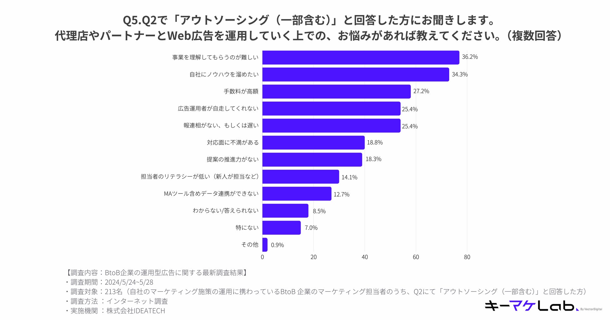 Web広告運用の代行を依頼する上での悩みは「事業を理解してもらうのが難しい」が36.2%で最多