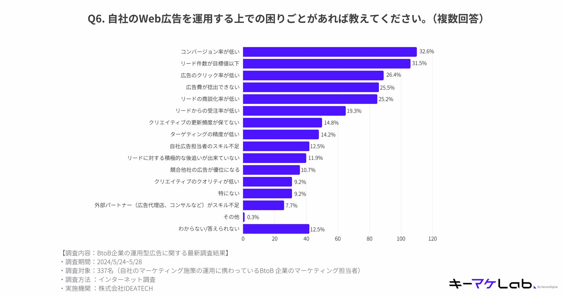 また、Web広告を運用する上での困りごとを聞いたところ、32.6%が「コンバージョン率が低い」、31.5%が「リード件数が目標値以下」、26.4%が「広告のクリック率が低い」と回答し、コンバージョン数などの獲得施策に課題を感じていることがわかりました。