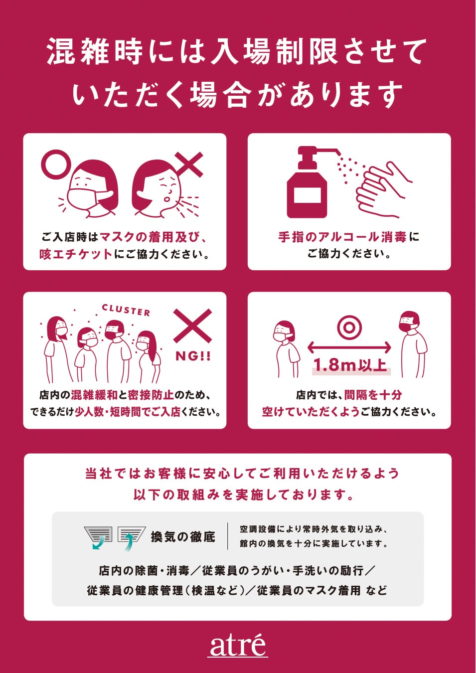 ・店内では間隔を十分空けてください(1.8m以上の距離の確保)