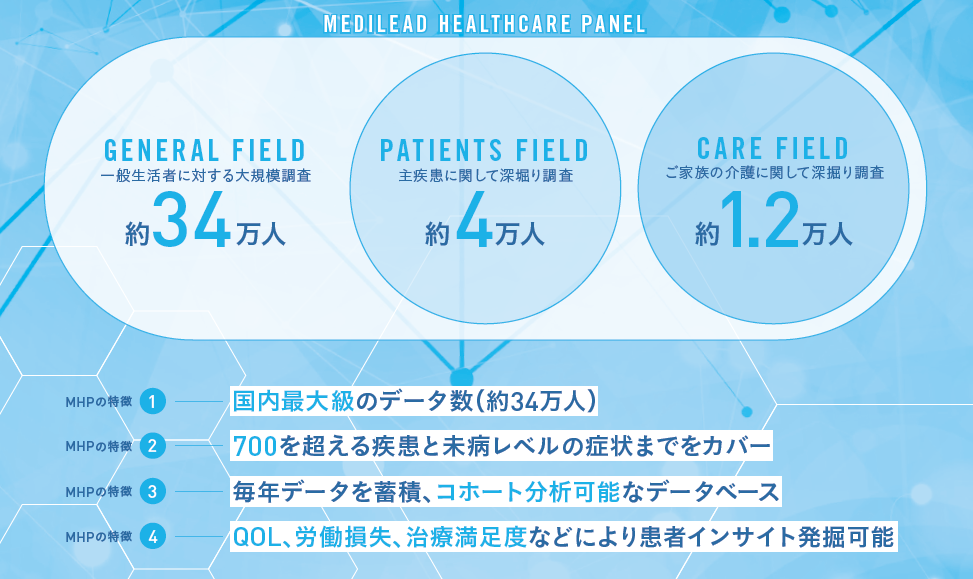 MHPは、疾患に関する国内最大規模のアンケートデータであり、(1)一般生活者の疾患情報に関する大規模調査(General Field)、(2)何らかの症状・疾患で入通院中の方に対して生活にもっとも影響を及ぼしている疾患に関する深掘調査(Patients Field)と(3)ご家族に何らかの症状・疾患があり介護されている方に対しての介護に関する深堀調査(Care Field)の3種から構成されています。回答者への追跡調査は、より深いインサイトの獲得を可能にすると共に、電子カルテ情報やレセプトデータなどの大規模データベースでは含まれないデータ(年収などの属性情報やQOLに関連する情報など)も多く、社会的に重要な意味を持つ分析も可能です。