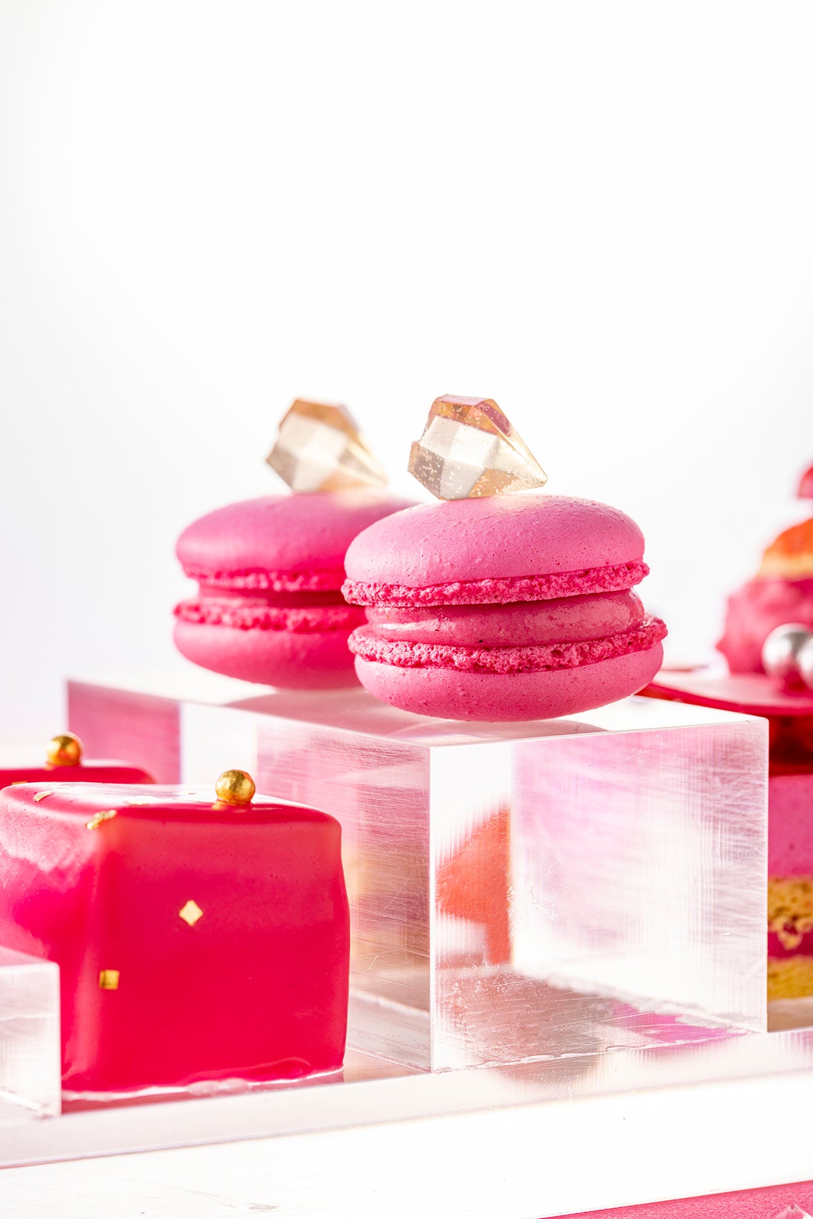 エグゼクティブペストリーシェフ 諸戸清貴によってクリエイトされたスイーツは、サプライズを秘めた味わいを。ストロベリーチョコレートのなめらかなクリームにむっちりとしたマシュマロを絞ったタルト、レモングラスとストロベリーソースが甘酸っぱく爽やかなスウィリ、アニスとエルダーフラワーのスパイス&ハーブが軽やかな口当たりのムースキューブなど、どれを食べても異なるフレーバーが隠れています。トップにはパールやダイヤを模ったトッピングが施され、ジュエリーボックスを開けたときのようなキュン♡な装いに。