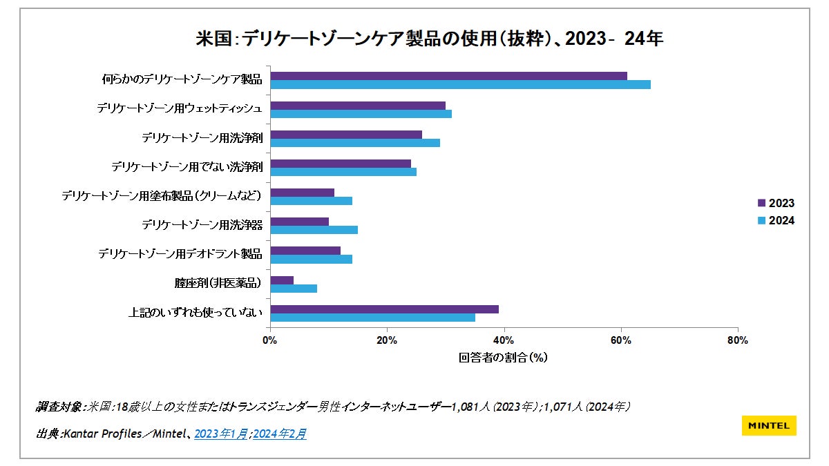 ミンテルの独自調査によると、アメリカでは、65%の女性またはトランスジェンダー男性がデリケートゾーンケア製品を使用しており、2023年の61%からやや使用率が上昇しています。また、デリケートゾーンケア専用でない製品を代用しケアをしている人が3割いることがわかっており、世界的に増加している同製品群の訴求内容を見ると安全性やエコなど付加価値をつけることで市場拡大の可能性が示唆されています。