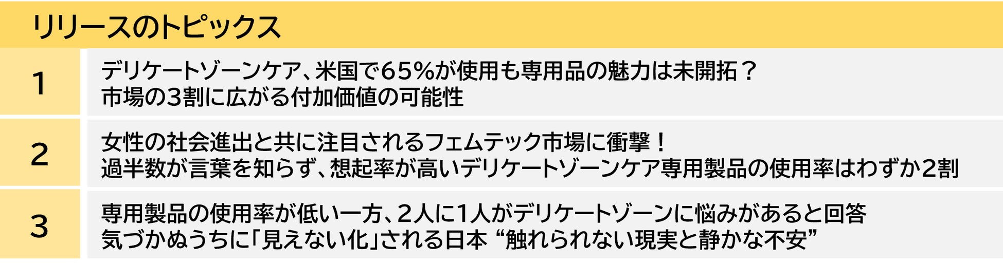 また、アメリカでは、消費者の3割がデリケートゾーンケア専用のウェットティッシュや洗浄剤を使用している一方、専用でない製品も3割が使用しています。日本の消費者で専用製品を使用していない人の中にも、専用でない製品を使用してデリケートゾーンケアをしている人がいるかもしれません。日本の各企業やブランドは、まずデリケートゾーンケアに専用製品が必要な理由を消費者に伝える必要がありそうです。