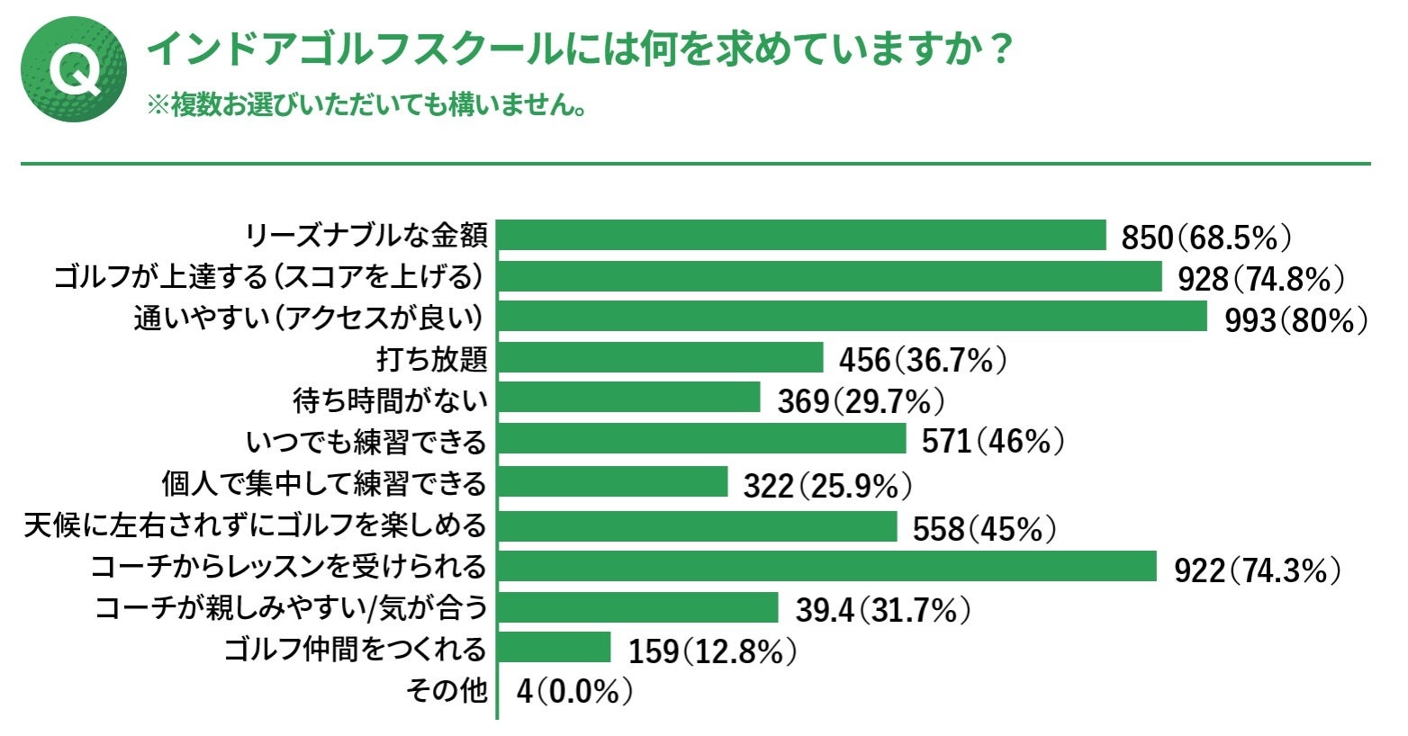 ▶インドアゴルフスクールに求めるものTOP3は、通いやすい(アクセス)、ゴルフ上達、コーチレッスン。通いやすさと上達の両立を期待されているインドアゴルフ