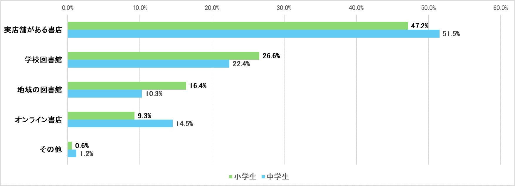 全体では、1位「実店舗がある書店」(48.6%)、2位「学校図書館」(25.2%)、3位「地域の図書館」(14.4%)の順となった。小・中学生別に比較すると、小・中学生ともに1位と2位は全体の1位・2位の回答と同じだが、3位は、小学生が「地域の図書館」(16.4%)、中学生が「オンライン書店」(14.5%)となり、違いが見られた。
