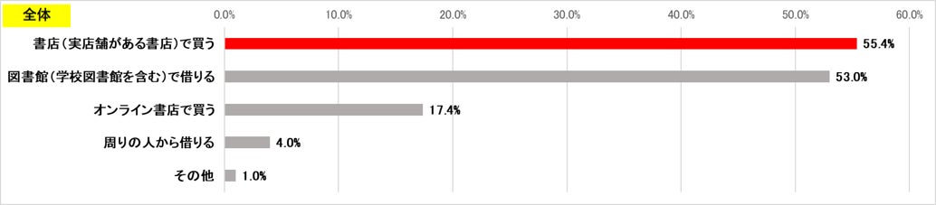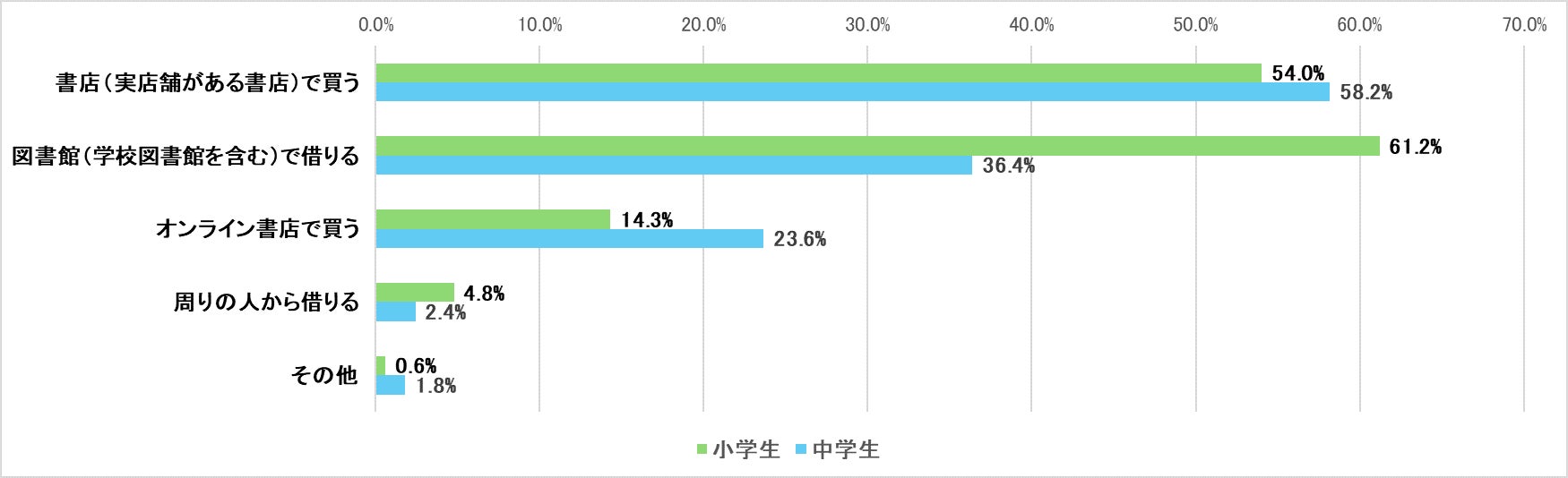 全体では、「書店(実店舗がある書店)で買う」(55.4%)、「図書館(学校図書館を含む)で借りる」(53.0%)という回答がそれぞれ半数以上となった。小・中学生別に比較すると、小学生では「図書館(学校図書館を含む)で借りる」(61.2%)が、中学生では「書店(実店舗がある書店)で買う」(58.2%)が、それぞれ1位となった。