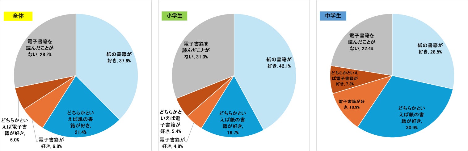 全体では、「紙の書籍が好き(好き/どちらかといえば好き)」が約6割(59.0%)、「電子書籍が好き(好き/どちらかといえば好き)」が1割超(12.8%)、「電子書籍を読んだことがない」が約3割(28.2%)となった。