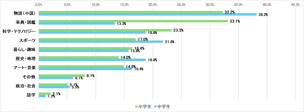 小・中学生別に比較すると、小学生は、1位「事典・図鑑」(33.1%)、2位「物語(小説)」(32.2%)、3位「科学・テクノロジー」(23.3%)となった。中学生は、1位「物語(小説)」(38.2%)、2位「スポーツ」(21.8%)、3位は「科学・テクノロジー」(18.8%)と「歴史・地理」(18.8%)の同率となった。