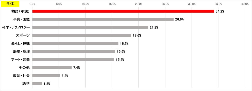 全体では、1位「物語(小説)」(34.2%)、2位「事典・図鑑」(26.6%)、3位「科学・テクノロジー」(21.8%)の順となった。