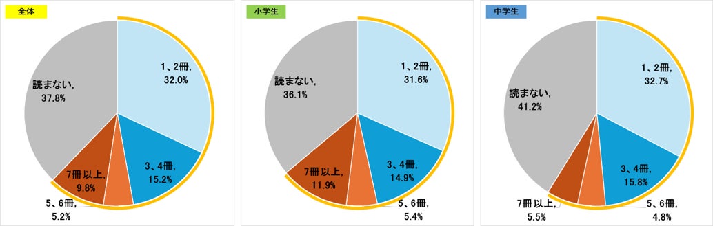 全体では、6割超(62.2%)が月に1冊以上の本を読んでいると回答した。また、3冊以上の回答の合計は30.2%となっていることから、約3人に1人が1か月に3冊以上の本を読んでいることがわかった。小・中学生別に比較すると、7冊以上という回答が、小学生11.9%に対して中学生5.5%であり、中学生では小学生の半数程度となることがわかった。