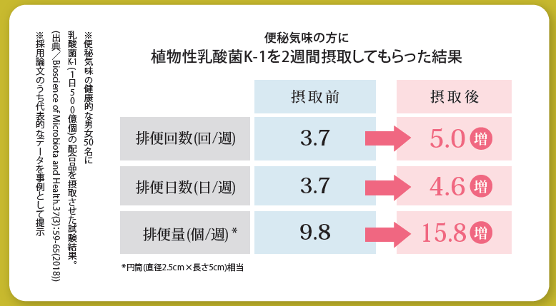 本品には植物性乳酸菌 K-1(L.casei327)が含まれます。植物性乳酸菌 K-1(L.casei327)には、おなかの調子を整えお通じを改善する機能があることが報告されています。