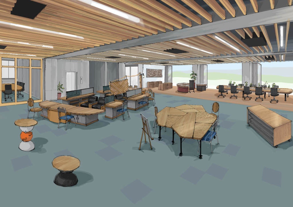新庁舎とその周辺エリアで構成される海士町新庁舎エリアは、海士町がたくさんのつながりを生み出しながら町民とともに未来へ漕ぎ出す船であるということを表現するために、愛称を「あま丸」と名付けました。この「あま丸」の中で、海士町らしさにこだわった注目のスペースが、未来共創スペース「しゃばりば」です。
