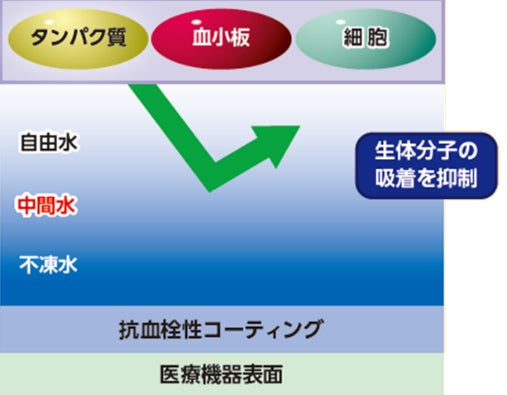 中間水コンセプト:生体分子や医療機器は生体内で含水状態に あり、その表面には水和層が形成される。表面に吸着した水分子は、以下の3種類に分類され、生体を構成する生体分子および生体適合性に優れた合成高分子には中間水が形成されるというコンセプト。