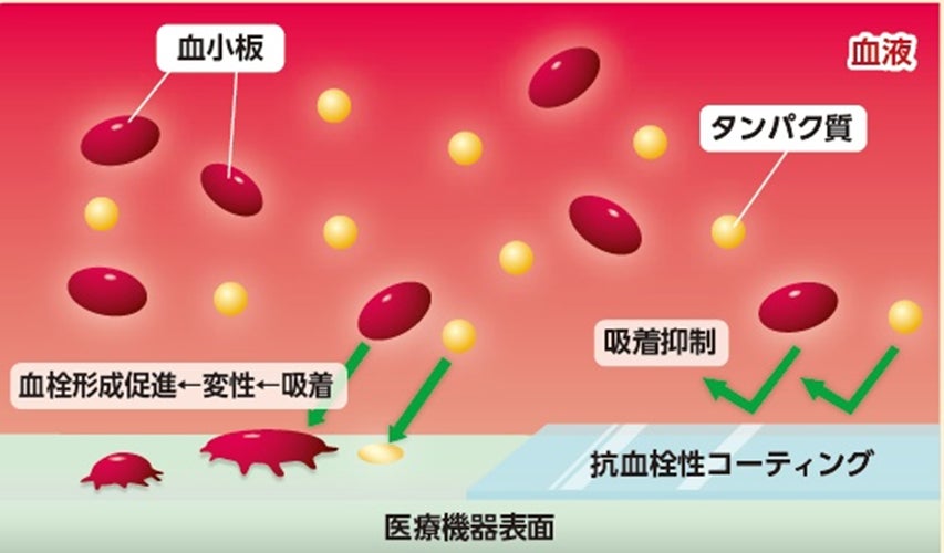 抗血栓性:生体適合性の中でも、血液と材料が接触した際に血栓が発生しない機能。血栓は血液が凝固することで発生し、血栓によって医療機器内のチューブが詰まる、微小血栓によって血管が詰まり脳塞栓症などの重篤な疾患を引き起こすなどの問題がある。