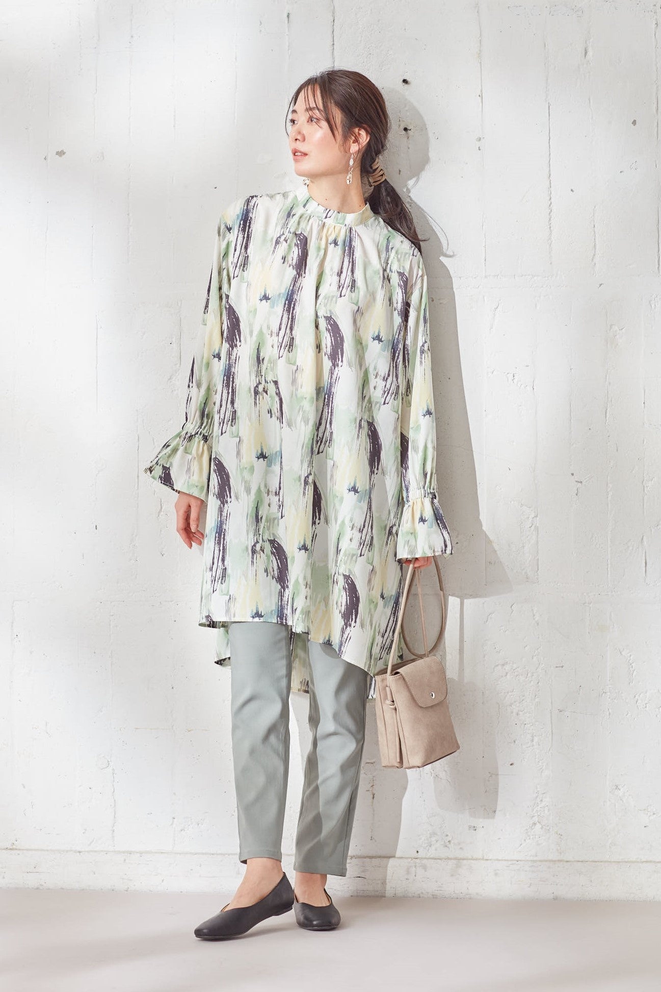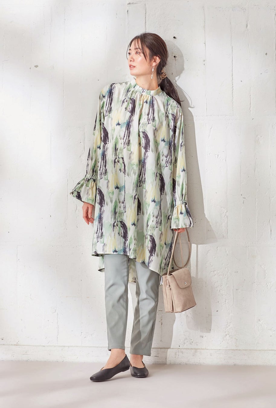 春らしいペールトーンのプリントが映えるチュニックワンピースにN+定番のマジックベルトストレッチパンツを合わせたコーディネート。チュニックワンピースは前後差のある丈がより軽やかなニュアンスに。パンツはすっきりシルエットと穿き心地の良さを両立させたN+定番のマジックベルトストレッチパンツ。伸縮自在のゴムがウエストにすっきり沿うので美しいシルエットを生み出しながらもストレスを与えない構造です。さらに色は6色展開となっているので様々なカラーコーディネートに合わせることができます。
