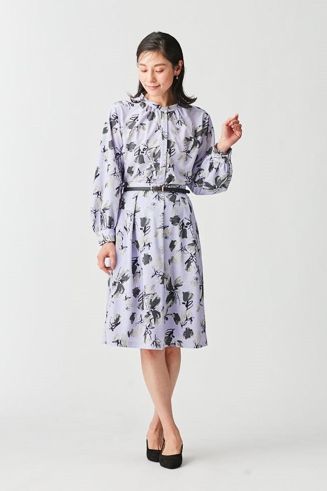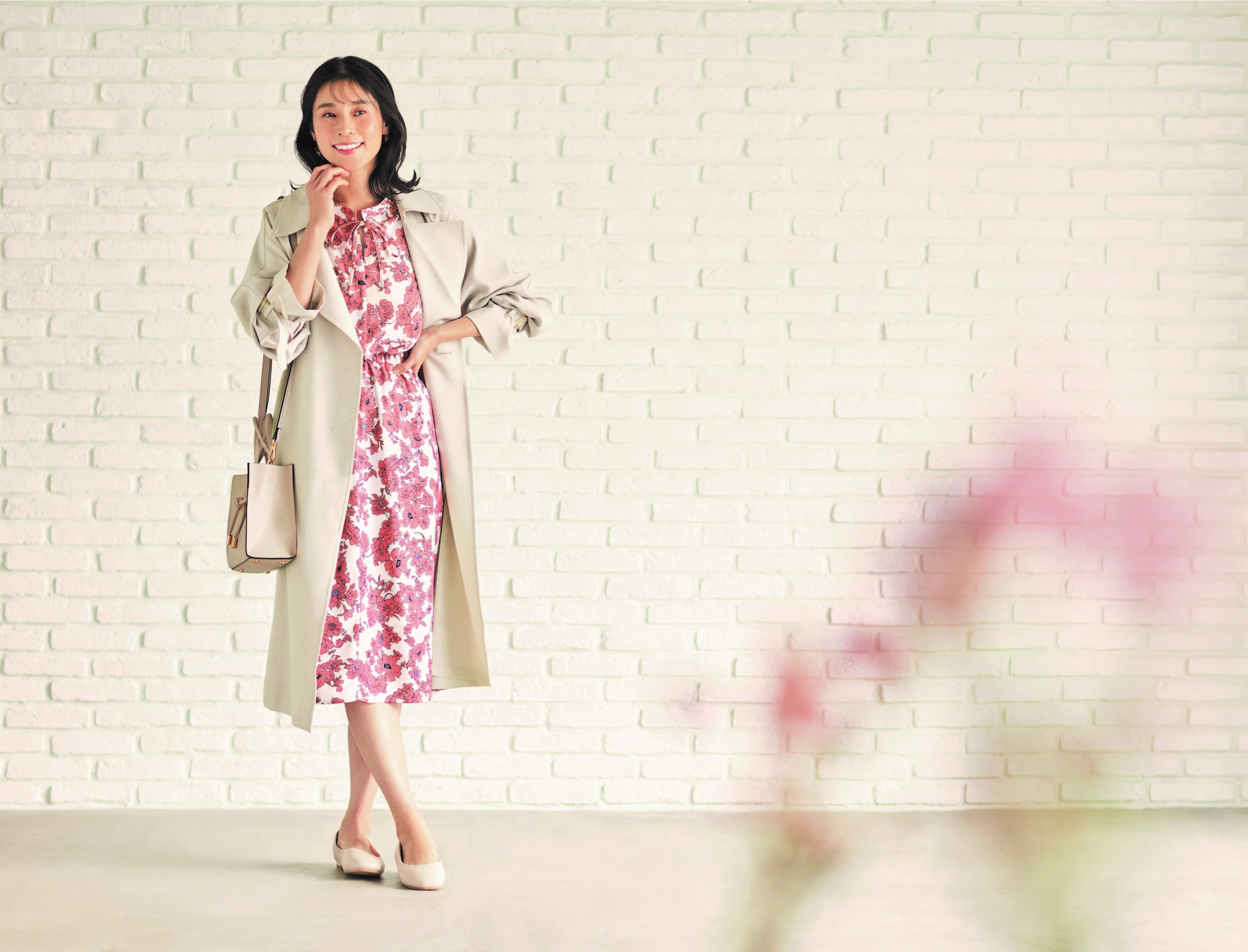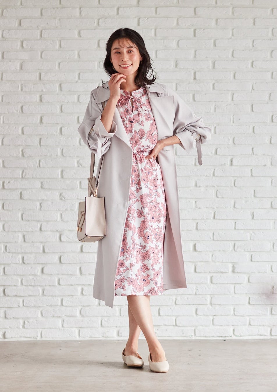 さっと羽織るだけで着こなしが決まる、スタイリッシュなトレンチコートに、春らしい花柄が華やかなワンピースを合わせたコーディネート。トレンチコートはドライタッチで肌離れが良く軽やか、こなれ感のある風合いがあり、高級感のある素材です。袖口のベルトやフラップポケットなどディティールにこだわりつつ着やすく仕上げています。ワンピースのウエストはゴムでブラウジングするデザインとなっていて、リラックス感のある着心地ながらメリハリがでてスタイルよく着こなせます。