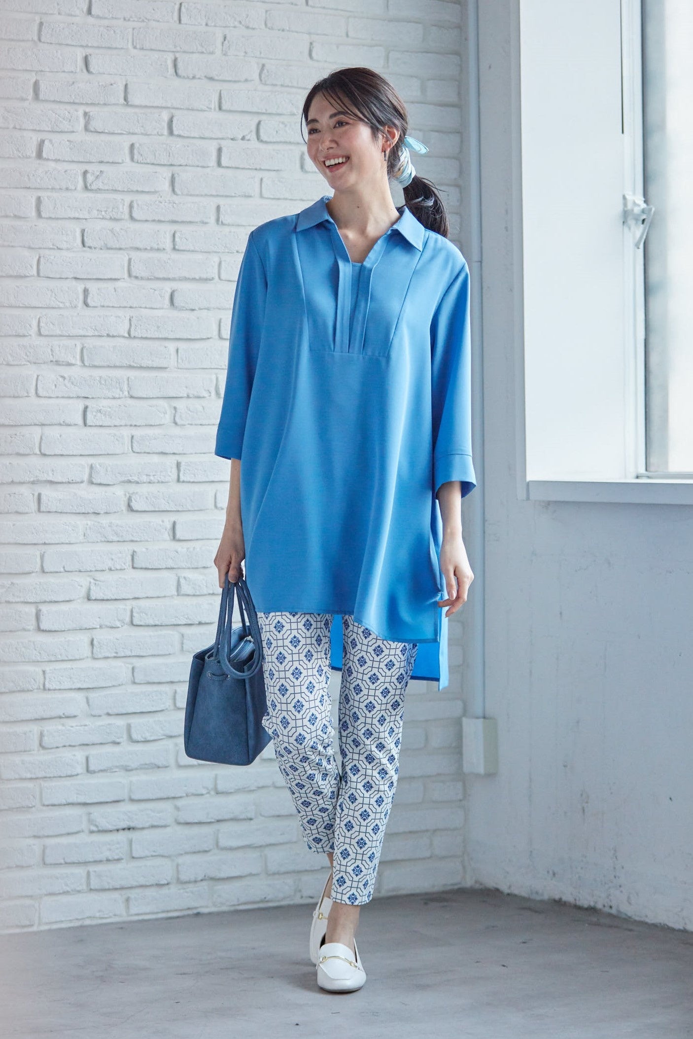 鮮やかなブルーが春に映えるコーディネート。チュニックブラウスは比翼見えの襟元デザインと落ち感ある素材がカジュアルながら上品な印象。レギンス感覚ではける柄パンツを合わせることで無難になりがちなレイヤードスタイルのおしゃれ度もアップします。