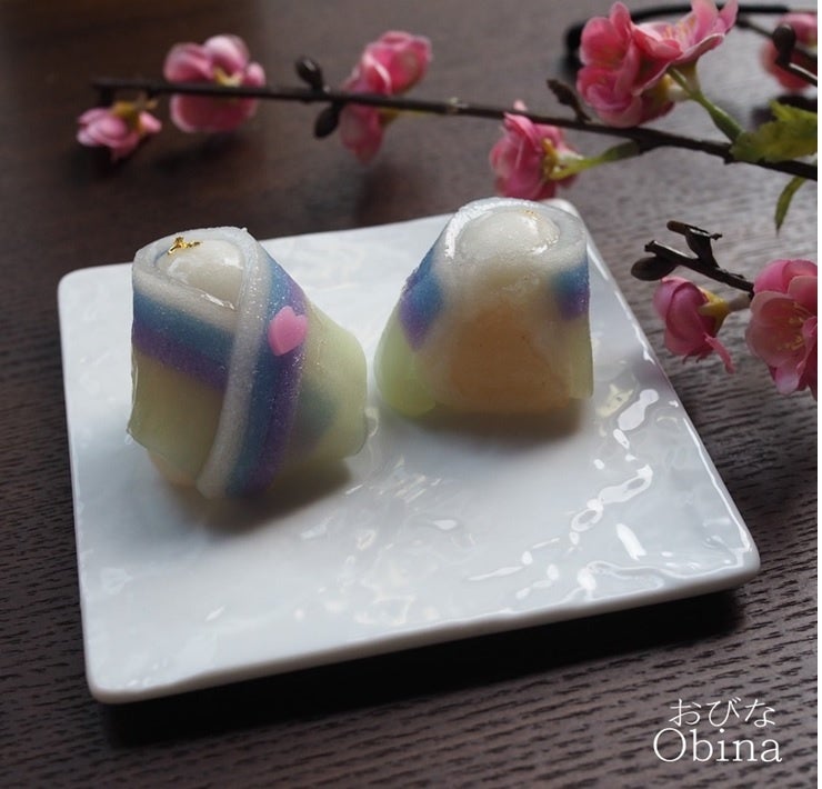 内側は求肥餅(もち粉、砂糖類を水で練り合わせ蒸し上げた餅生地)で餡を包んでいます。外側は羊羹をカラフルに3色にして着物のイメージでそれぞれ巻いてあります。光沢感を出すために顔周りに寒天を塗り、冠のイメージで頭に金箔を載せています。胸に花びらを載せて可愛く仕上げています。ワンポイントの胸の桜の花びらは羊かんを型抜きで抜いたものです。