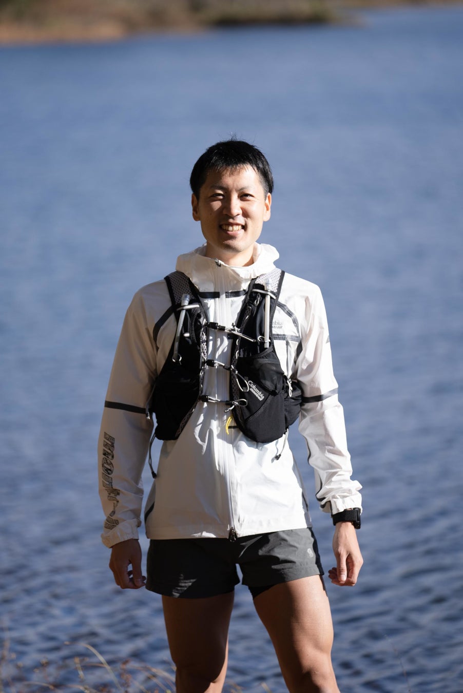 レースではできるだけザックを下ろさないのが鉄則。前にジェルなどの補給食を入れ、脇にはヘッドライト。背面の外ポケットにはウィンドシェルなどのさっと羽織れるものを入れます。これでだいたいのものは背負ったままアクセスできます。ちなみに、後ろに小さなファスナーポケットがあるんですよ。ここは鍵やコンパクトな財布などですかね。