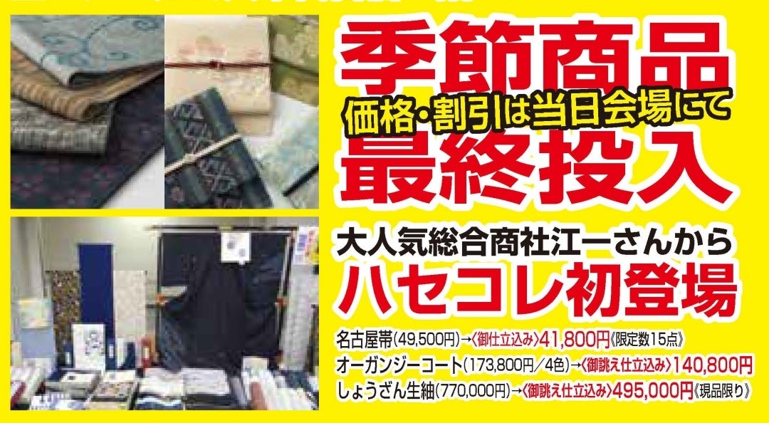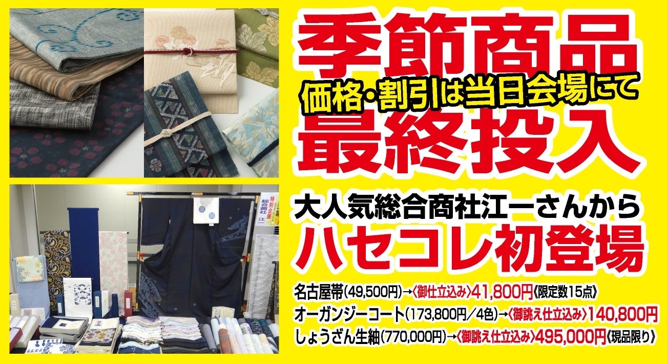 江一ブランド品、名古屋帯、オーガンジーコート、しょうざん生紬など、季節商品を最終投入!