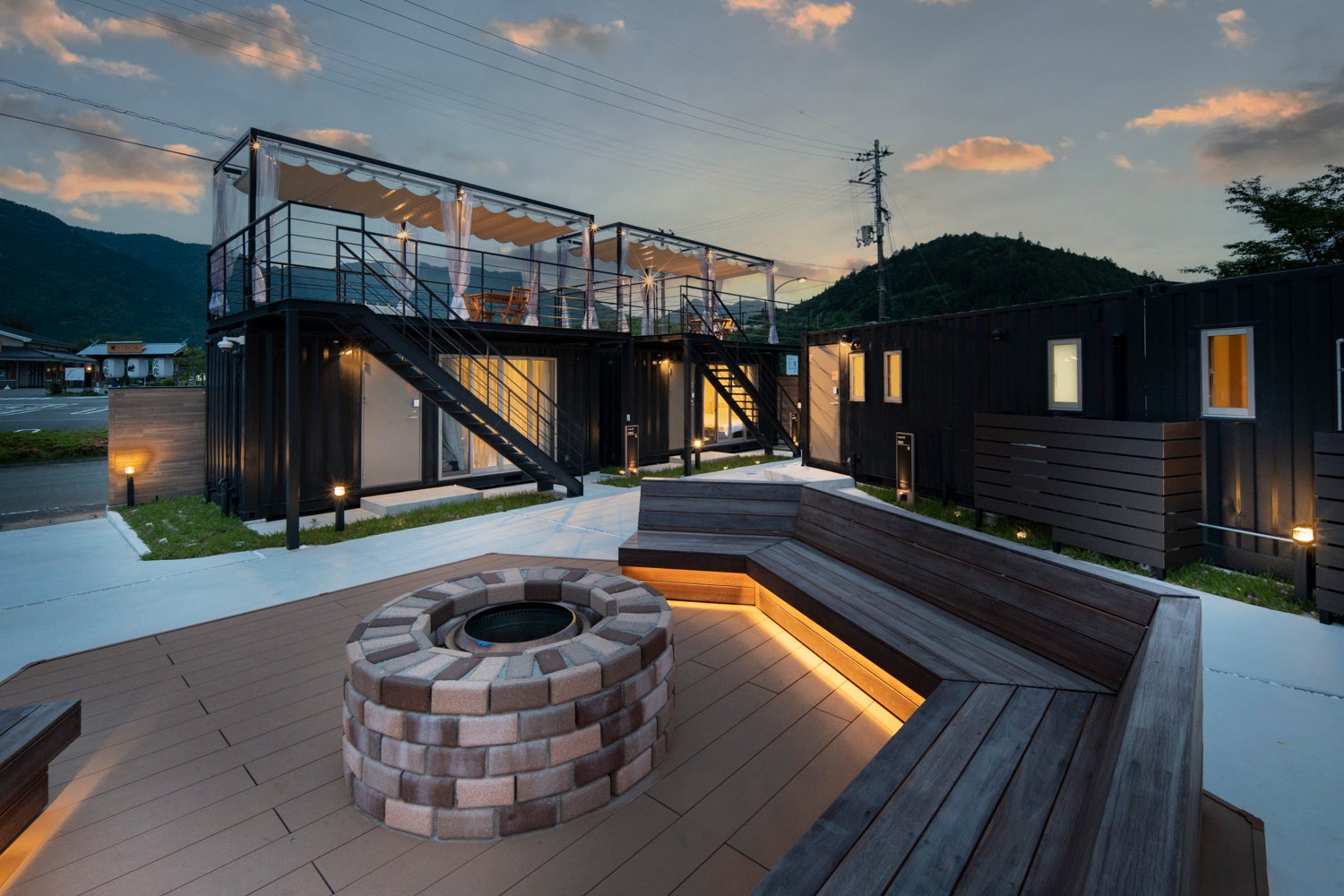 熊野古道の主要参詣道「中辺路」沿いに泊まり歩ける宿を計4カ所作る計画で、2カ所目として、2022年4月28日に開業したのが「SEN.RETREAT CHIKATSUYU」。コンセプトは「遊ぶ、微笑む、そしてつながる宿」。バーベキューができるプライベートガーデンや、焚き火を囲めるテラス、宿泊客自身で生地からこねて焼けるピザ窯などを備えています。非日常にワクワクしたり、気の置けない仲間や家族とゆったり過ごしてホッとしたり、リラックスできる空間となっています。また、コンテナ1棟を1つの客室としているため、外から直接部屋に出入りでき、密を避けられます。「熊野古道を訪れる観光客=トレッキング目的のみ」という現状を変えるべく、さまざまな観光目的の方に楽しんでいただける宿を目指します。