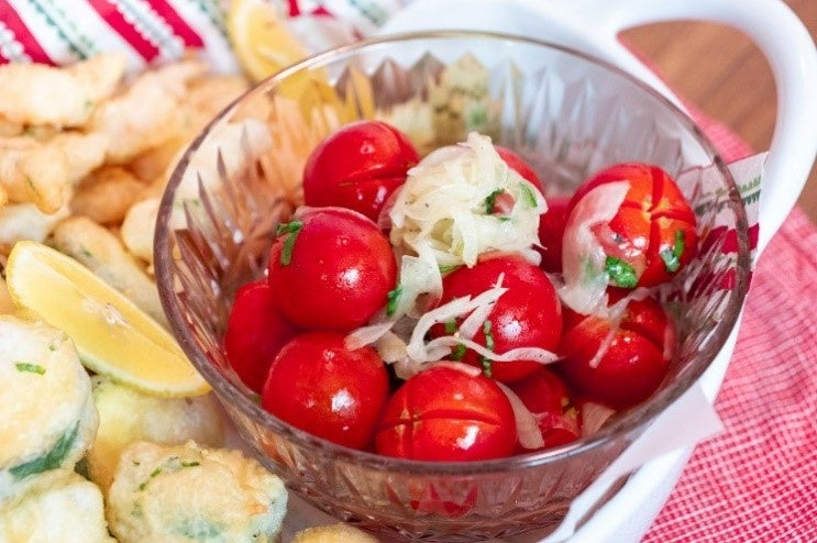 クリスマスや年末年始などのパーティーシーンにピッタリな、「日清こめ油」で揚げた“ズッキーニとエビのフリット”、「日清MCTオイル」で和える彩鮮やかな“ミニトマトのMCTオイルマリネ”の2品と、その盛り付け方についてのレッスンを実施。参加者と一緒に調理をしながら、料理の作り方やおいしく仕上げるコツを紹介した後、ペーパーナプキンなどを用いた華やかな盛り付け方のポイントを解説しました。