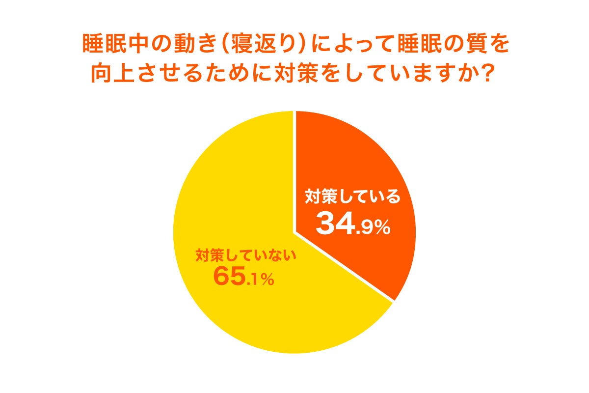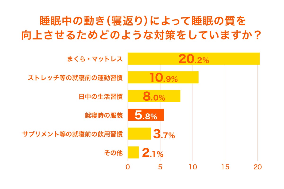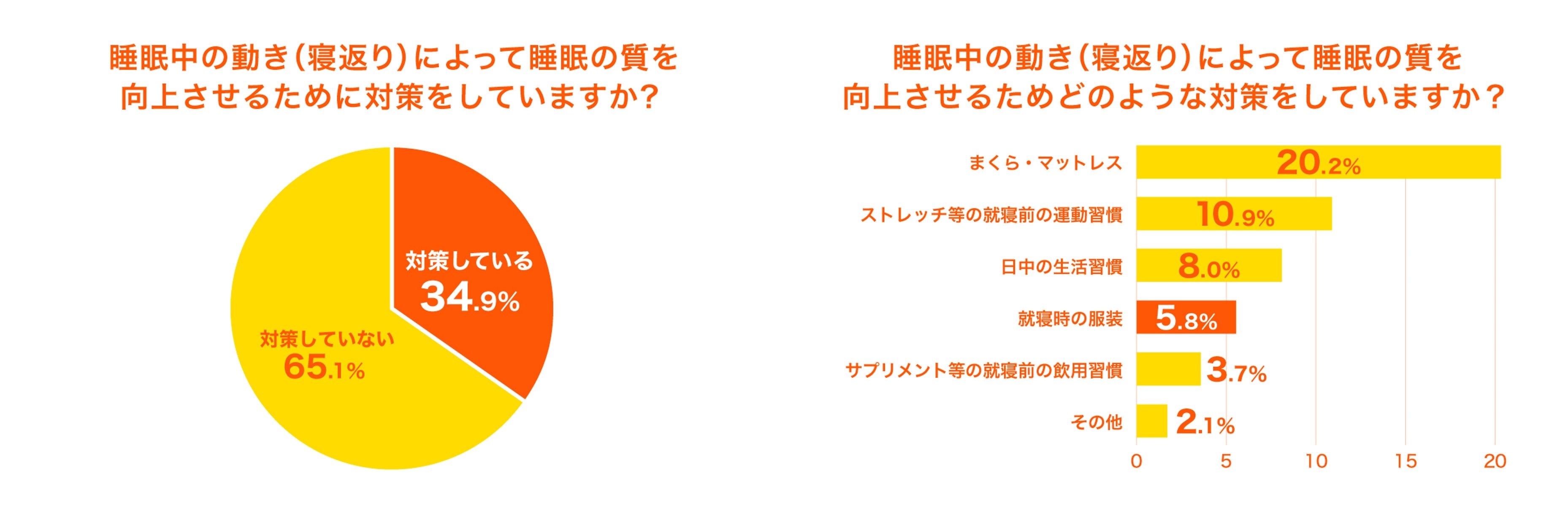 睡眠中の動きに対して対策をしている人は34.9%。その中では「まくら・マットレス」が20.2%と最多でした。就寝時の服装で対策していると回答した人は、約1/4となる5.8%にとどまり、パジャマへの関心がまだまだ低いことがわかる結果となりました。