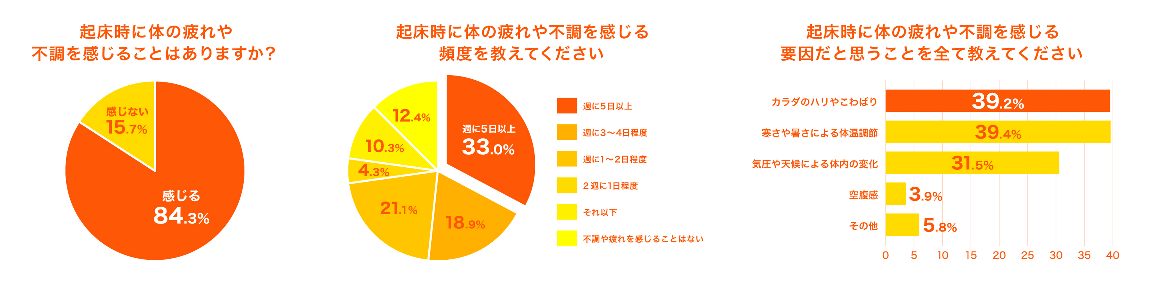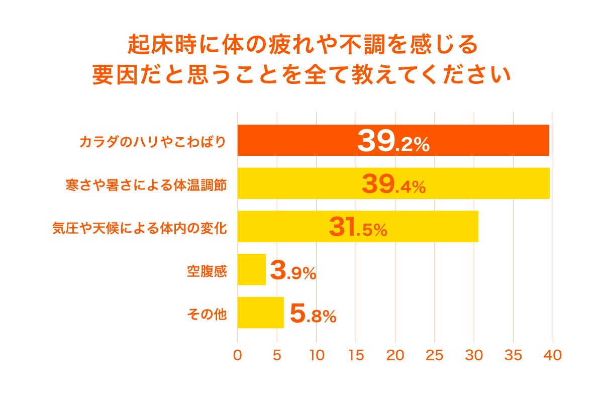 起床時に体の疲れや不調を感じる頻度についての質問に対し、84.3%が不調を感じていると回答。その頻度は「ほぼ毎日」が最多の22.4%、「週5~6日」と合わせると33.0%で、3人に1人が週5日以上起床時に不調や疲れを感じていることがわかりました。また、疲れや不調の要因として、39.2%が「カラダのハリや こわばり」と回答。気温や天候の変化が激しい10月には、慢性的に起床時の疲れや不調を感じる「寝起きゾンビ」のような状態への対策に注目が集まりそうです。
