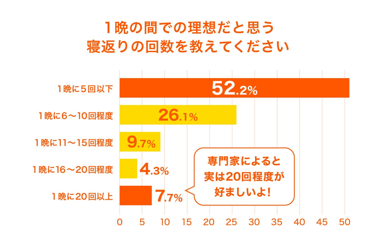 理想的な寝返りの回数を尋ねたところ、「1晩に5回以下」を理想の回数と答えた人が52.2%と最多で、「睡眠時はあまり動かない方が良い」と認識している人が半数程度いることがわかりました。ところが、ヒラノマリさんによると、1晩の適切な寝返りの回数は「20回前後」とのことで、認識に大きな開きがあることが判明しました。