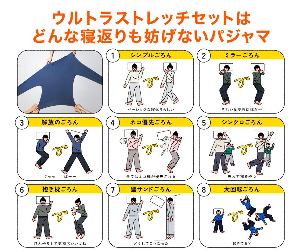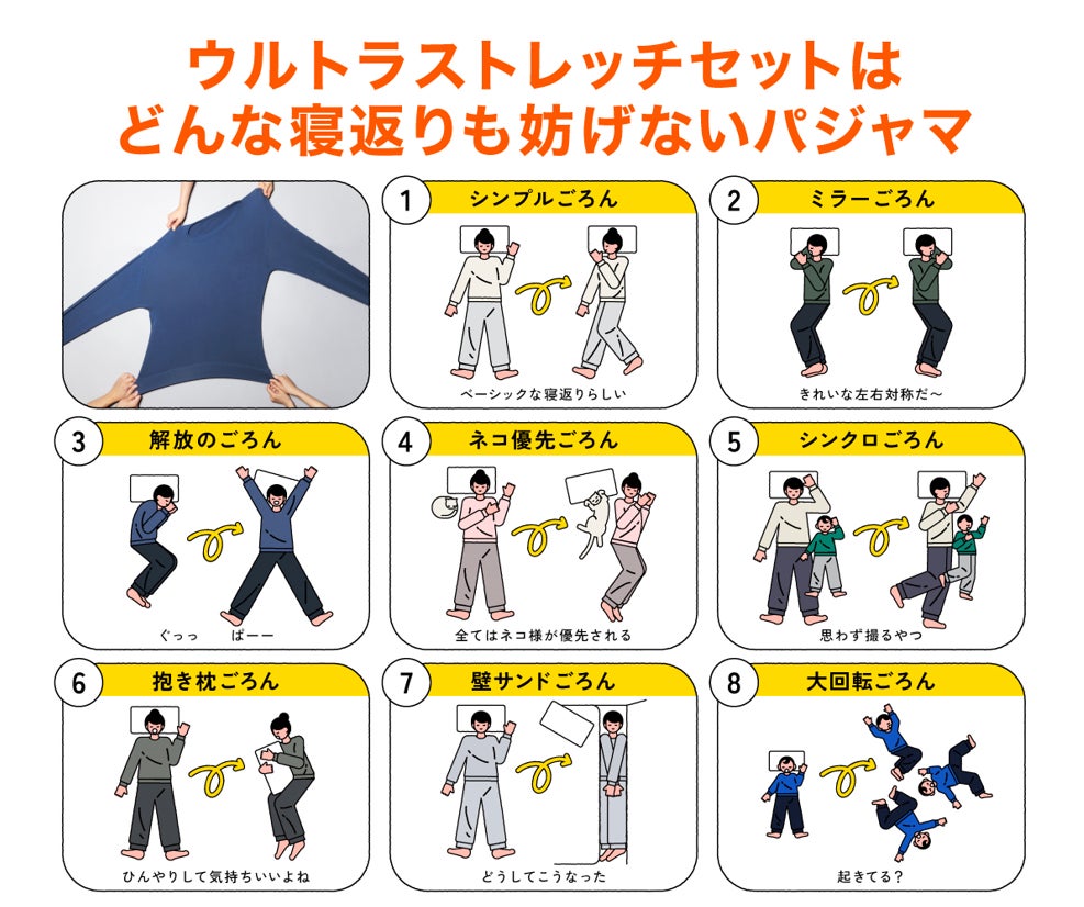 あらゆる寝返りに対応する、ウルトラストレッチセットの性能を親しみやすく伝える、8つのあるあるな寝返りイラスト。自分自身がやったことがある、家族がやっているのを見たことがある、そんな寝返りが見つかるかもしれません。ぜひ探してみてください。