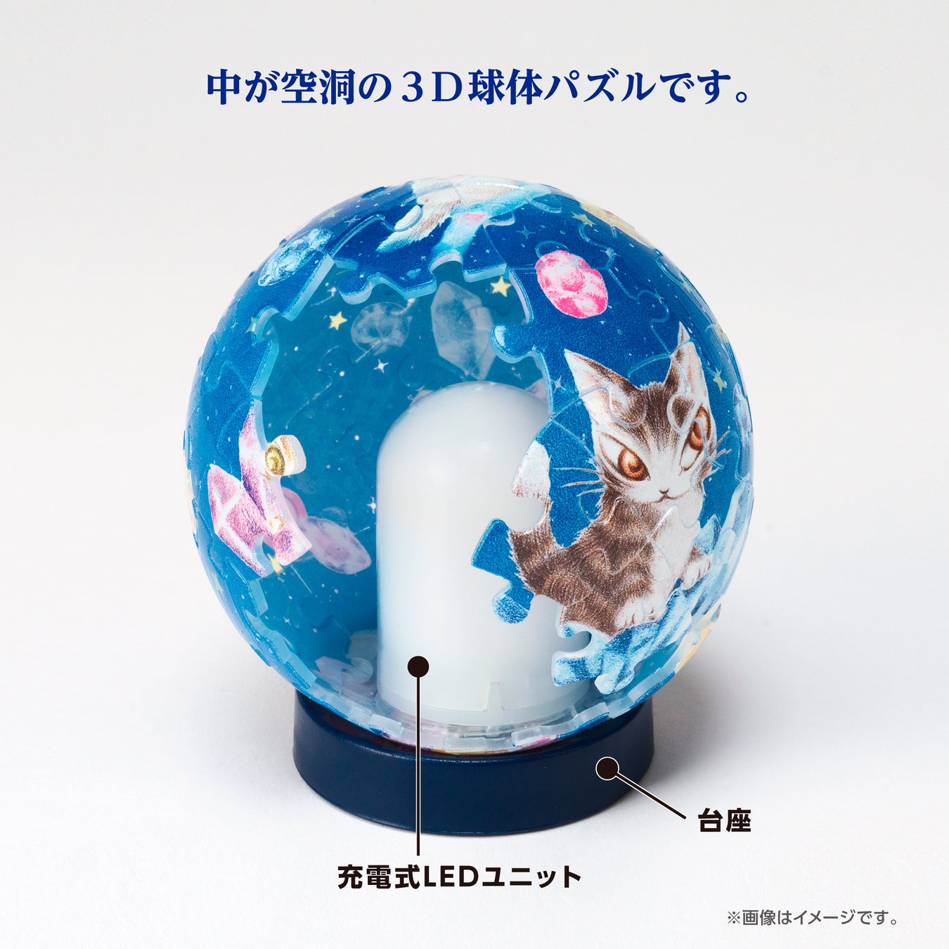 一つ目は、発光する球体パズル『ルミオーブ』で「ダヤンと時の流れ星」 。付属の充電式LEDユニットをセットすると内側から幻想的に光り輝き、さらに消灯時には見えない絵柄がライト点灯時に浮かび上がる「隠し絵」のギミックが施されています 。夜空の星々や水晶が光を透過する様子は、まさに幻想的なインテリアです 。