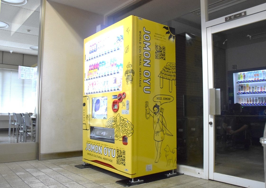 また、この協定に基づき、「北海道・北東北の縄文遺跡群」PR自動販売機(以下「縄文PR自販機)を、鹿角市役所内、および鹿角花輪駅前観光案内所に設置いたしました。このたび設置した縄文PR自販機は、市民や遺跡来訪者に対する機運醸成を広く図ります。併せて、縄文PR自販機の売上金の一部を、「北海道・北東北の縄文遺跡群」に係る各種PR活動への支援金として、鹿角市に寄付いたします。縄文遺跡群は、北海道に6つ、青森県に8つ、岩手県に1つ、秋田県に2つあり、北東北を事業エリアとする当社は、縄文PR自販機にその地域ならではのデザインをあしらいながら設置を増やすことで、観光客の回遊を促し地域経済への貢献を狙います。