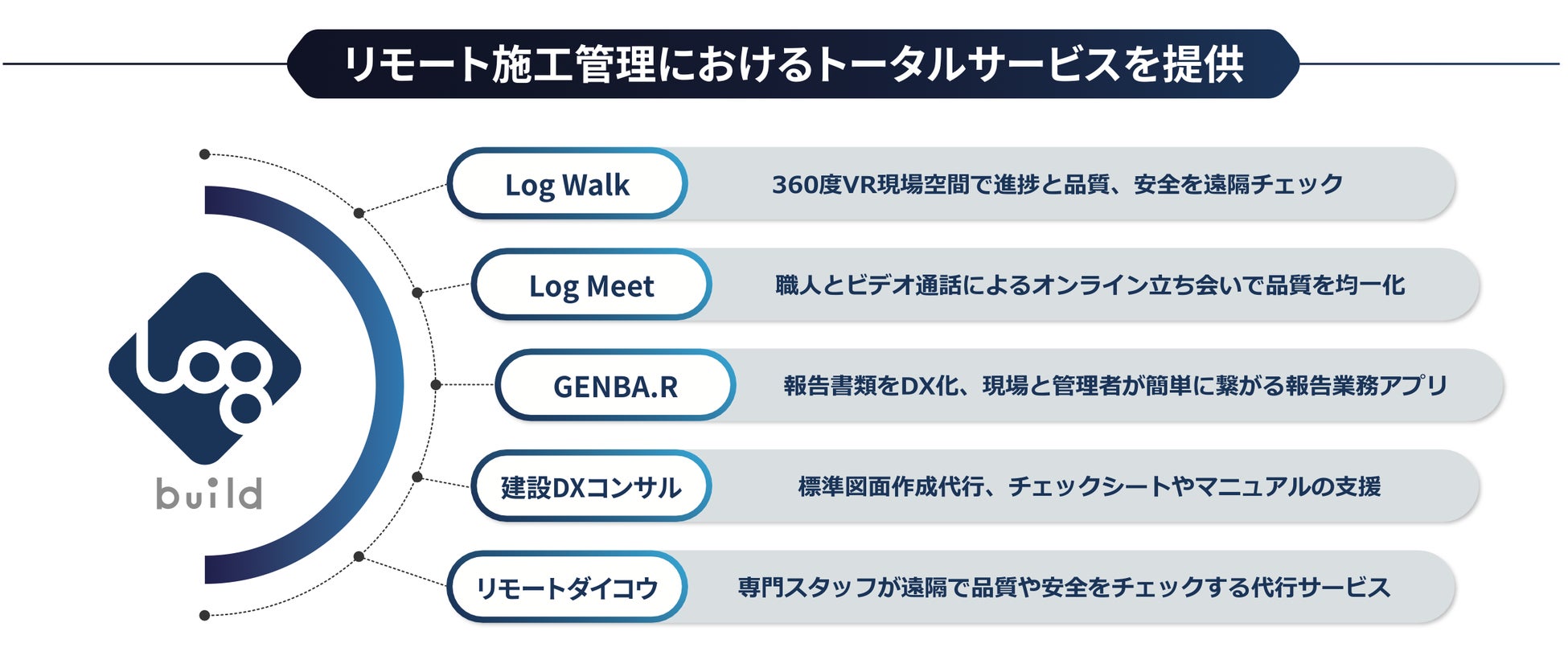 ※日本初:「VR現場空間」「ビデオ通話による遠隔立会い」「標準図面の作成代行」「リモート現場管理代行」「DXコンサル」など、遠隔施工管理に必要なすべてのサービスを提供する企業として、日本初(自社調べ、2025年5月時点)。