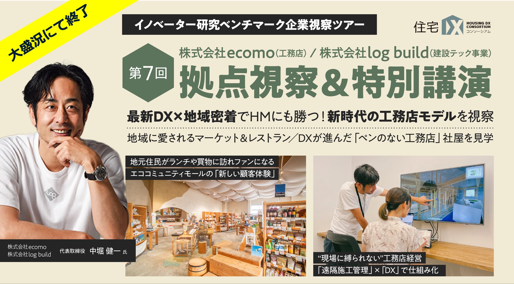【5月9日開催】ecomo×log build 視察ツアーが大盛況にて終了─建築DXの成功モデルを体感─“ペンのない工務店”ecomo×log build視察ツアーに、全国から経営層15名が集結