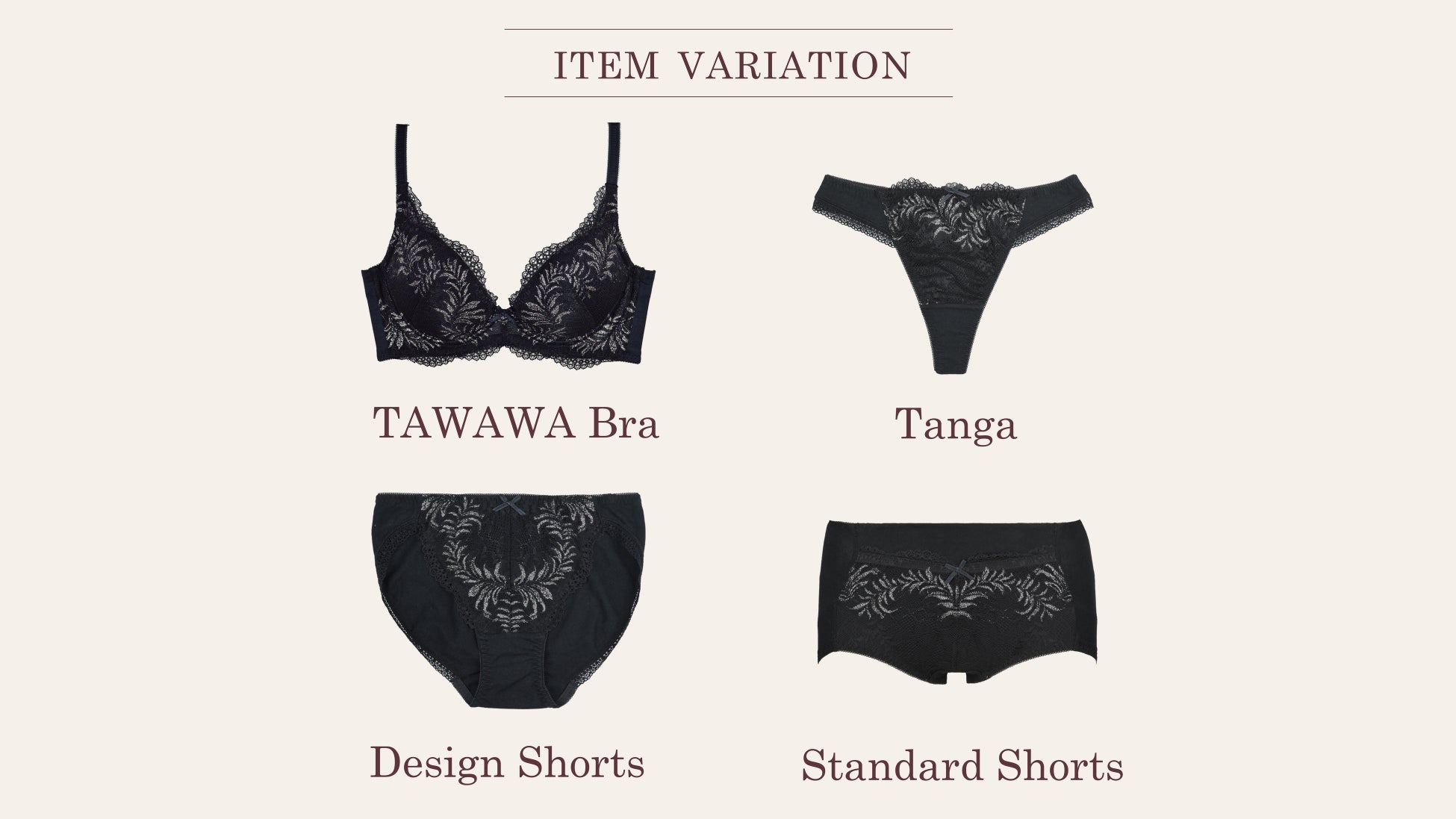 キラキラと輝くシルバーのラメ入りストレッチラッセルレースを使用し、繊細なリーフ柄を表現したTAWAWAブラの新色はお客様からのご要望にお応えした、使いやすいベーシックカラーの「ブラック」と愛らしい暖色カラーの「フレッシュピンク」の2色。ブラとセットでコーディネートを楽しみながら、バストだけでなく全身を魅力的に演出します。