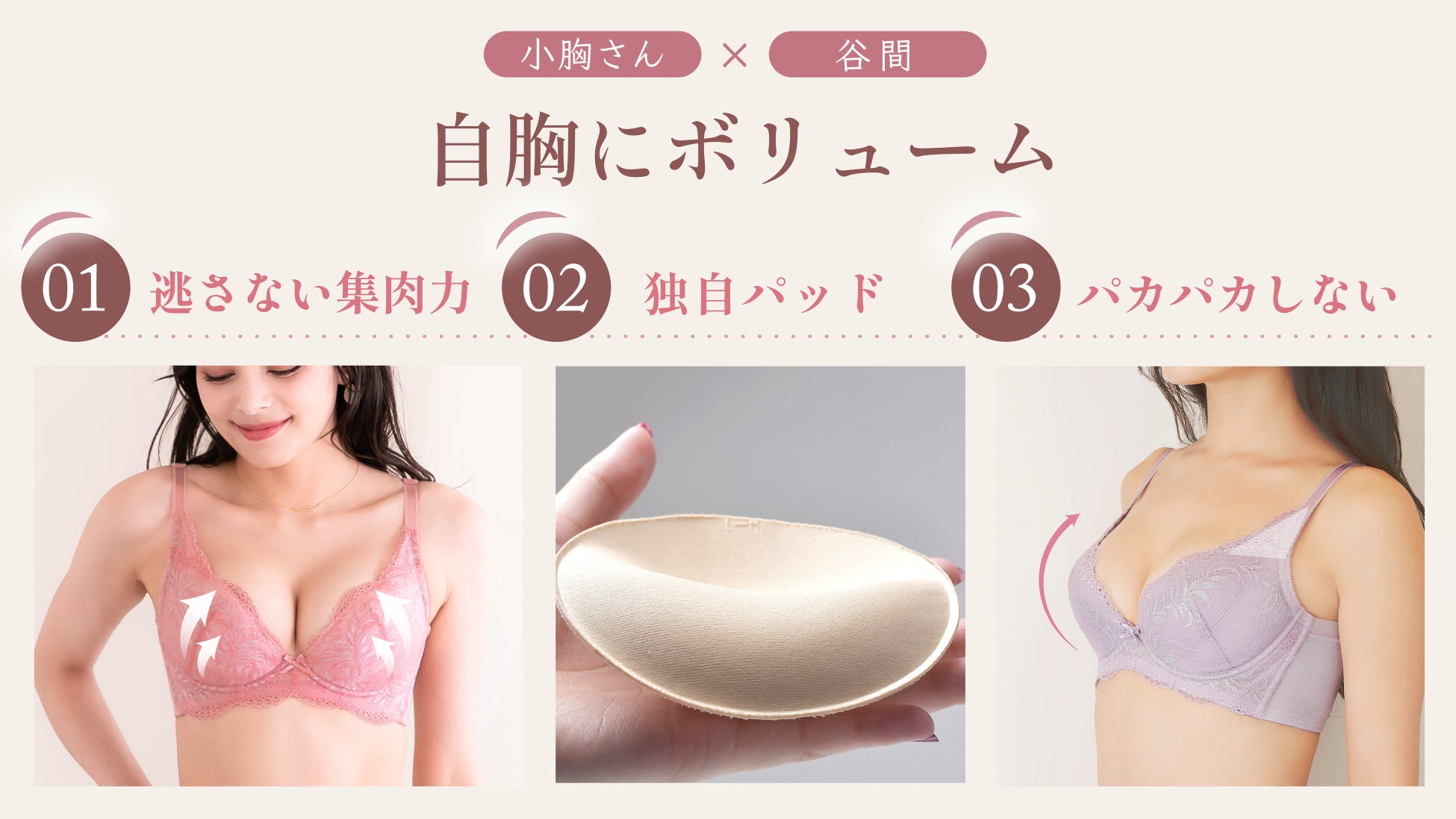 従来の小胸さん向けのブラは、厚手パッドでバストを押し上げるためバストをつぶして形が崩れてしまいがち。TAWAWAブラ専用のパッドは特殊な形状で、バストをつぶさないよう計算されたカップとの組み合わせによりバストに負担をかけることなく自然にふっくら盛れるので、“谷間”も“見た目のボリューム”も叶えることができます。