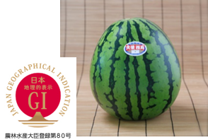 「大栄西瓜」とは、鳥取県内でも有数のスイカの産地北栄町(旧大栄町)で栽培される大玉スイカです。この「大栄西瓜」は、地理的表示保護制度(GI認定)に登録されており、北栄町で栽培された形状、品質にばらつきの少ない安定した品質のスイカとして評価されています。
