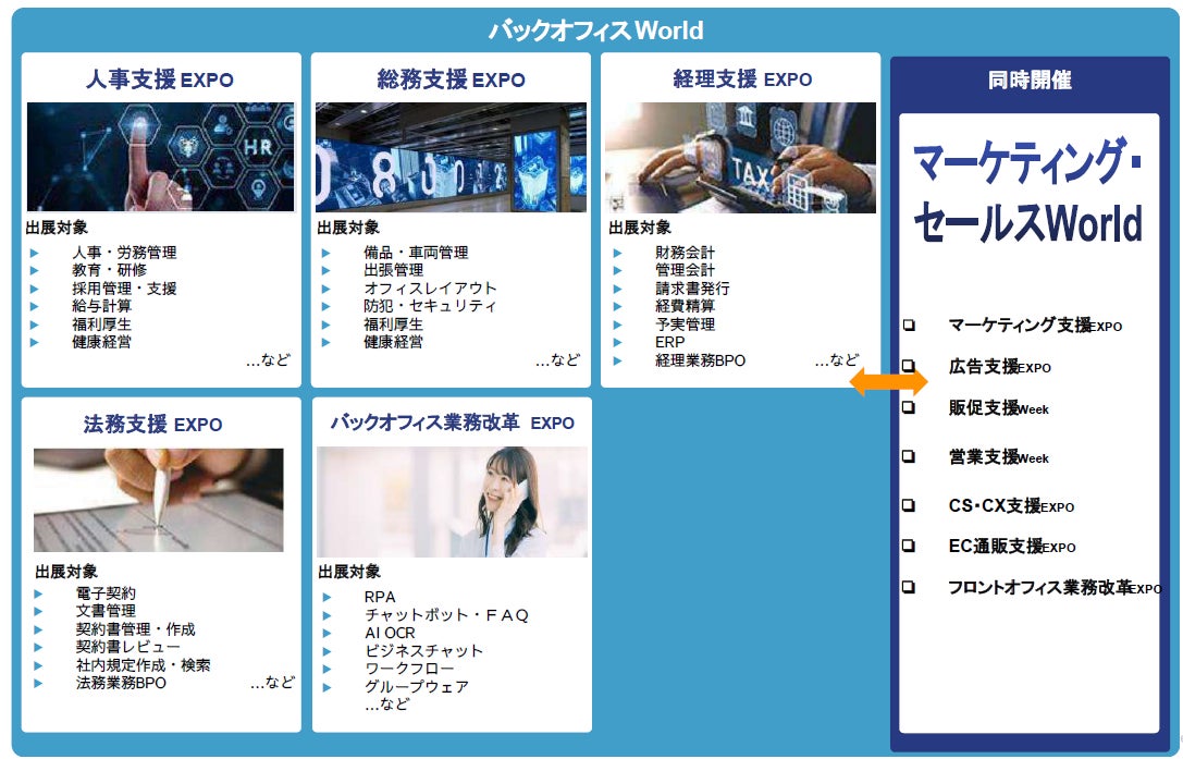 総務・人事・経理・法務などバックオフィス部門の業務効率化を実現する最新ソリューションが一堂に出展。