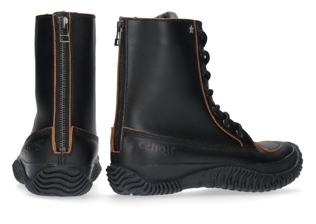 ライダースジャケットで知られるSchottと、レザースニーカーを得意とするSPINGLEは、ともに、レザーアイテムがアイコンのブランドです。ライダースジャケットと親和性のあるバイクブーツをモチーフにした今コラボレーションモデルでは、ベースとなるアッパーに、使い込むほどにワイルドさを増していく牛の茶芯レザーを採用しました。Schottの代名詞でもあるライダースジャケット「ワンスター」にあしらわれる星型スタッズをブーツ両サイドの履き口に、かかとに素押しのSchottロゴを配置しています。アウトソールは、タウンからバイクのライディングまでハードな使用にも耐えるスピングルのラバーソールです。