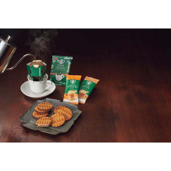 ■商品説明:贅沢な甘さのスイーツ「キャラメルサンドクッキー(6個入り)」と、スターバッグスオリガミパーソナルドリップコーヒーをセットにしたカフェ好きの方におすすめのギフト。